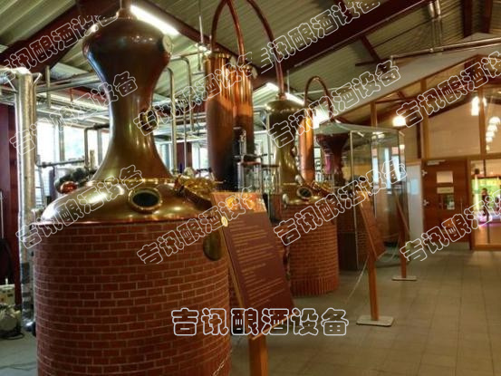 本機屬單次蒸餾機組,采用夏朗德蒸餾器與糧食酒蒸鍋部分優勢特色,酒汽聚集在上方的球形回流器中,產生少量回流提餾,經由延長拔高蒸汽導管或天鵝之頸,使雜質下沉與提餾,然后酒氣進入冷卻器,在冷卻器中冷凝出粗酒,原酒三四十度左右。把一次 出的原酒重新加入蒸餾器進行二次蒸餾,得到所需原酒,一般酒度為遞減過程。或者采取“切酒”方式取酒,蒸餾時的蒸汽,酒精濃度高,稱為“酒頭”,要和其他的分離,隨后獲得的是“酒心”,它是清澈透明的烈酒,取其酒心,然后低度酒混入發酵液或收集做二次蒸餾。